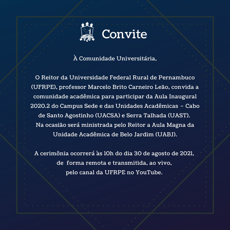 A Universidade Federal Rural de Pernambuco (UFRPE) realiza no dia 30 de agosto, às 10h, a Aula Inaugural do Campus Sede (Dois Irmãos) e das Unidades Acadêmicas – Cabo de Santo Agostinho (UACSA) e Serra Talhada (UAST). Na ocasião será ministrada pelo Reitor, professor Marcelo Brito Carneiro Leão, a Aula Magna da Unidade Acadêmica de Belo Jardim (UABJ).