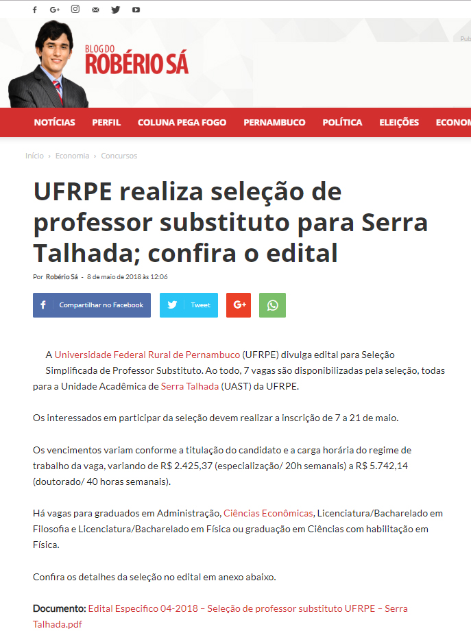 [BLOG DO ROBÉRIO SÁ] UFRPE realiza seleção de professor substituto para Serra Telhada; confira o edital