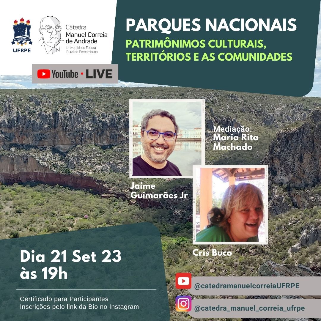 A Cátedra Manuel Correia de Andrade realiza, na próxima quinta-feira (21/09), às 19h, a Live Parques Nacionais: Patrimônios Culturais, Territórios e as Comunidades. O evento faz parte de um ciclo de ações da Cátedra, vinculada ao Departamento de História da Universidade Federal Rural de Pernambuco (UFRPE), com o objetivo de apresentar, em debates, as diversas pesquisas dos membros da instituição nas áreas Sociais e das Humanidades nos níveis de graduação e pós-graduação. Mediada pela coordenadora da instituição, a Professora Dra. Maria Rita Machado, a live será transmitida ao vivo pelo canal no Youtube da Cátedra Manuel Correia de Andrade e, depois, disponibilizada para futuras consultas.