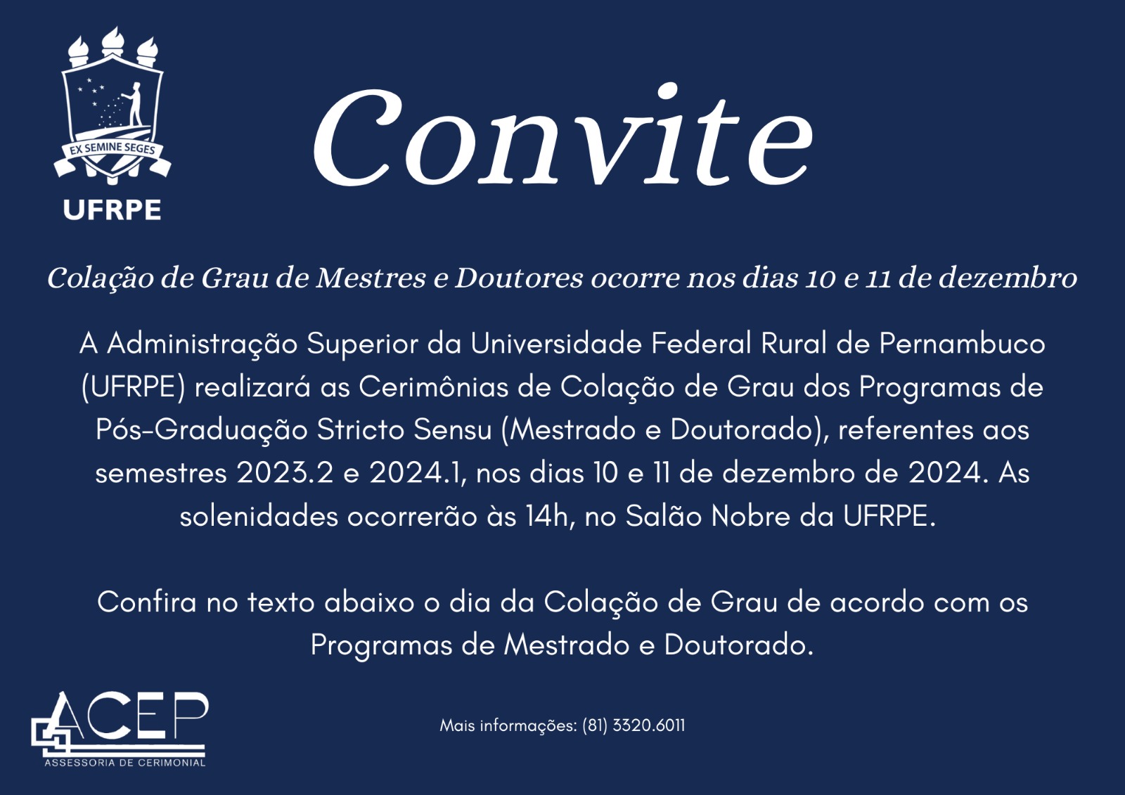 As presenças dos(as) coordenadores(as), substitutos(as) eventuais e docentes dos programas participantes serão de extrema relevância para abrilhantar as cerimônias de Colações de Grau dos(as) mestres(as) e doutores(as) da UFRPE.