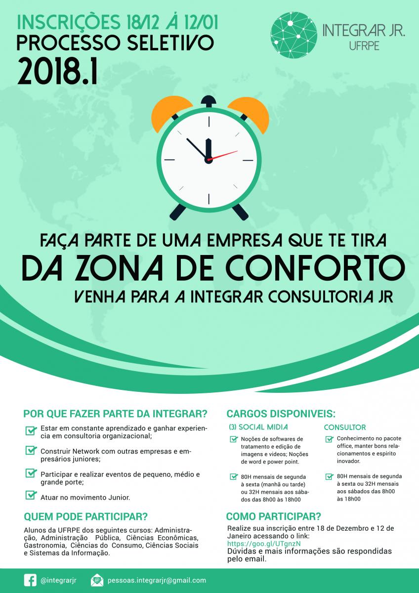 A Consultoria Júnior da UFRPE anuncia o primeiro processo seletivo da Integrar Jr para o ano de 2018. Serão ofertadas vagas para consultores(as) e social media. Desta forma, pretende-se selecionar 3 social media para atuarem no horário da manhã, tarde ou aos sábados e os candidatos à consultores que melhor se saírem nas dinâmicas e entrevistas.