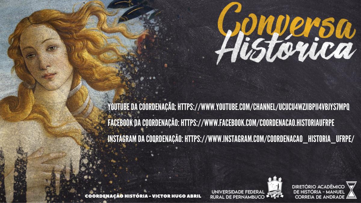 A Coordenação do curso de História da UFRPE inciou, no dia 28/04/2020, o Projeto Lives. Tal iniciativa, intitulada Conversa Histórica, congrega os professores do nosso DEHIST, convidados e tem o apoio da Pós-Graduação em História da UFRPE. O intuito, nesse momento de pandemia, é trazer acolhimento aos nossos estudantes através de lives e atividades programadas nos diversos canais da coordenação. Em momentos como esse precisamos estar próximos mesmo que distantes, “fechar portas e abrir janelas”. Sintam-se bem-vindos. Nossas lives são sempre anunciadas em nossas redes sociais (YouTube, Facebook e Instagram) e tem como horários às 15hs e (ou) às 19hs.