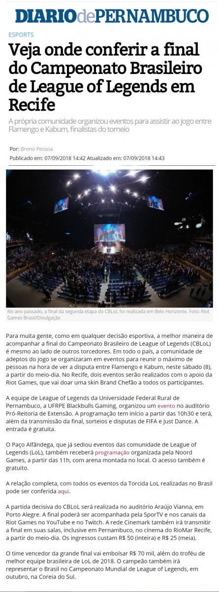 [DIÁRIO DE PERNAMBUCO] Veja onde conferir a final do Campeonato Brasileiro de League of Legends em Recife