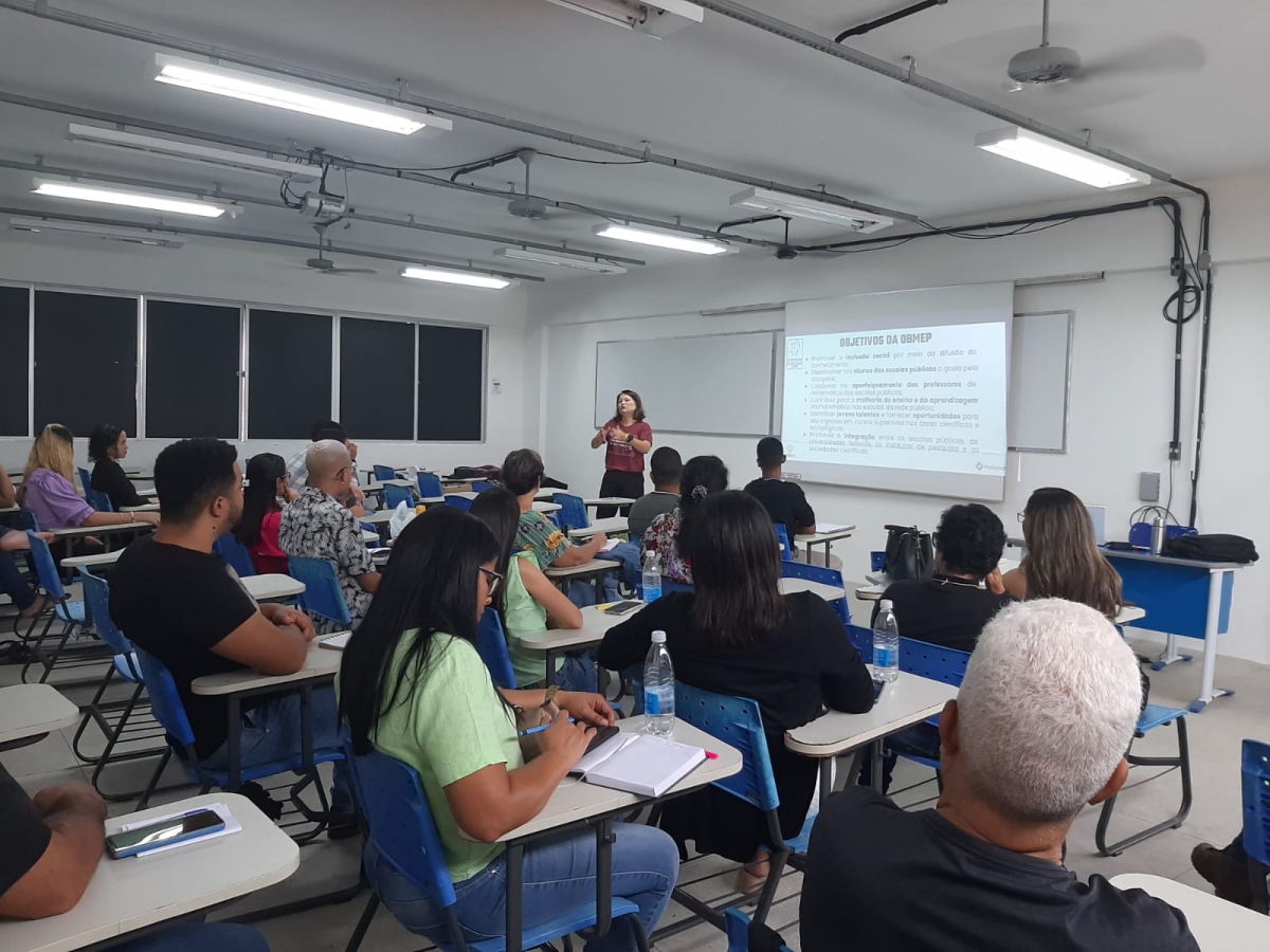 Pela manhã, a coordenadora local do projeto e docente da UPE-CMN, Islanita Cecília de Albuquerque, discorreu sobre o projeto, que recebe apoio do Edital PROEC 01/2023 - PFA. Posteriormente, a docente da UFRPE e coordenadora geral do projeto, Maité Kulesza, abordou o contexto das olímpiadas no Brasil, apresentando a Olimpíada Pernambucana de Matemática (OPEMAT) e diversos projetos relacionados à olimpíadas que são realizados pelo Departamento de Matemática da UFRPE, incluindo a revista "É Matemática, Oxente!".