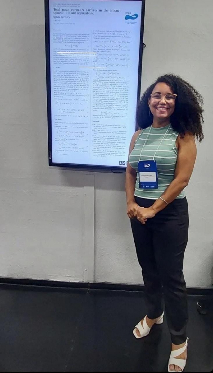 O Colóquio também contou com a participação de egressos e egressas do curso de Licenciatura em Matemática da UFRPE. Sally Andria Vieira da Silva, atualmente docente na Universidade Federal Fluminense (UFF), ministrou, juntamente com colegas, o minicurso “Contando retas em superfícies no espaço projetivo” e apresentou o trabalho intitulado “Abel maps for tropical curves via tropical geometry” na mesma sessão temática que a professora Bárbara Costa da Silva. Já a Dra. Sylvia Ferreira da Silva, atualmente docente na Unidade Acadêmica do Cabo de Santo Agostinho da Universidade Federal Rural de Pernambuco (UACSA – UFRPE), apresentou o pôster intitulado “Total mean curvature surfaces in the product space Sn x R and aplications” e participou da mesa intitulada “Perspectivas da juventude matemática brasileira: uma mesa redonda voltada aos professores e gestores da graduação e pós-graduação em matemática no país”. O egresso Matheus Nunes Soares, doutorando da Universidade Federal de Pernambuco (UFPE) apresentou o pôster intitulado “Lower bounds for the length of the second fundamental form via the first eigenvalues of the p-Laplacian”. A egressa, Elisa Joaquim Santos, hoje doutoranda na UFPE, apresentou o pôster Princípio do Máximo no Infinito e Aplicações.
