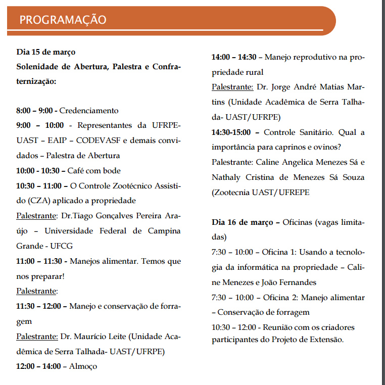 A realização do “Encontro de Criadores do Centro de Manejo Reprodutivo e Melhoramento Genético de Caprinos e Ovinos de Parnamirim” nos dias 15 e 16 de março de 2018, tem como finalidade reunir os criadores da região para participarem de palestras e oficinas voltadas as necessidades dos produtores da região. A primeira edição do Encontro de Criadores do Centro de Manejo Reprodutivo e Melhoramento Genético de Caprinos e Ovinos de Parnamirim terá como tema central a importância do manejo zootécnico na criação de caprinos e ovinos.