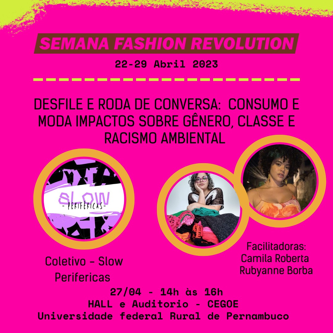 O segundo é Ciências do consumo & moda periférica, que será uma roda de conversa; discentes do curso de Ciências do Consumo promovem um batepapo bem bacana com o coletivo SlowPeriféricas que utiliza a moda como ferramenta política. O coletivo SlowPeriféricas é um movimento independente, formado por militantes do movimento negro e periférico recifense. O coletivo SlowPeriféricas, também fará uma performance (desfile) e, por meio de suas produções, busca a consciência socioambiental junto à identidade e representação periférica fazendo uso do upclycling (reaproveitamento) e busca proporcionar um espaço combativo. ( https://semanafashionrevolution.com.br/evento/ciencias-do-consumo-moda-p... )