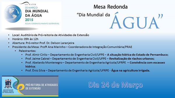 Em comemoração ao Dia Mundial da Água a UFRPE realiza eventos sobre o tema “Água e Desenvolvimento Sustentável”. Nesta terça-feira (24/03), das 9h às 12h, será realizada uma mesa redonda no auditório da Pró-Reitoria de Atividades de Extensão (PRAE).