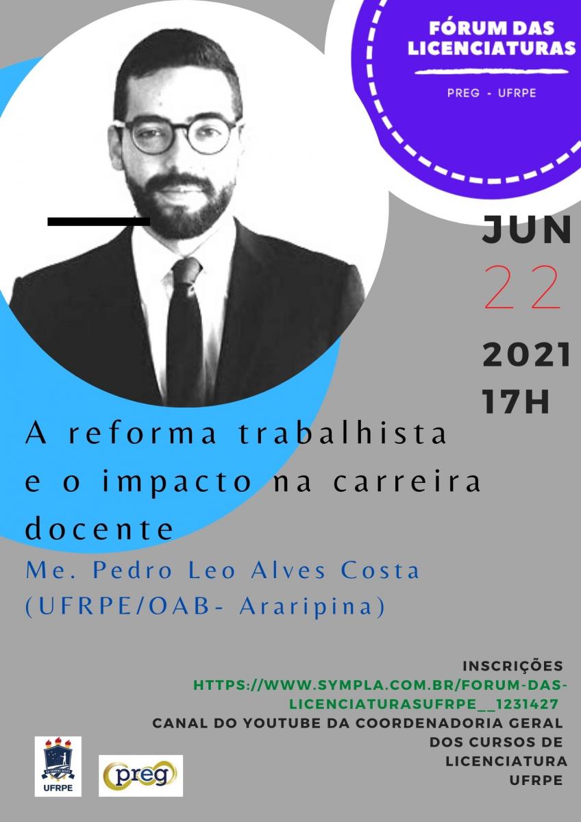 No próximo dia 22 de junho, às 17 horas, haverá nova edição do Fórum das Licenciaturas da UFRPE. Nessa 3ª edição de 2021, a temática se volta para os direitos trabalhistas dos profissionais da educação, tendo em vista a última Reforma Trabalhista. Será um momento ímpar para se debater as mudanças e tirar dúvidas sobre o tema. Para a discussão, o convidado é o professor de Direito Pedro Léo Alves Costa, da UAST/UFRPE e da OAB de Araripina.
