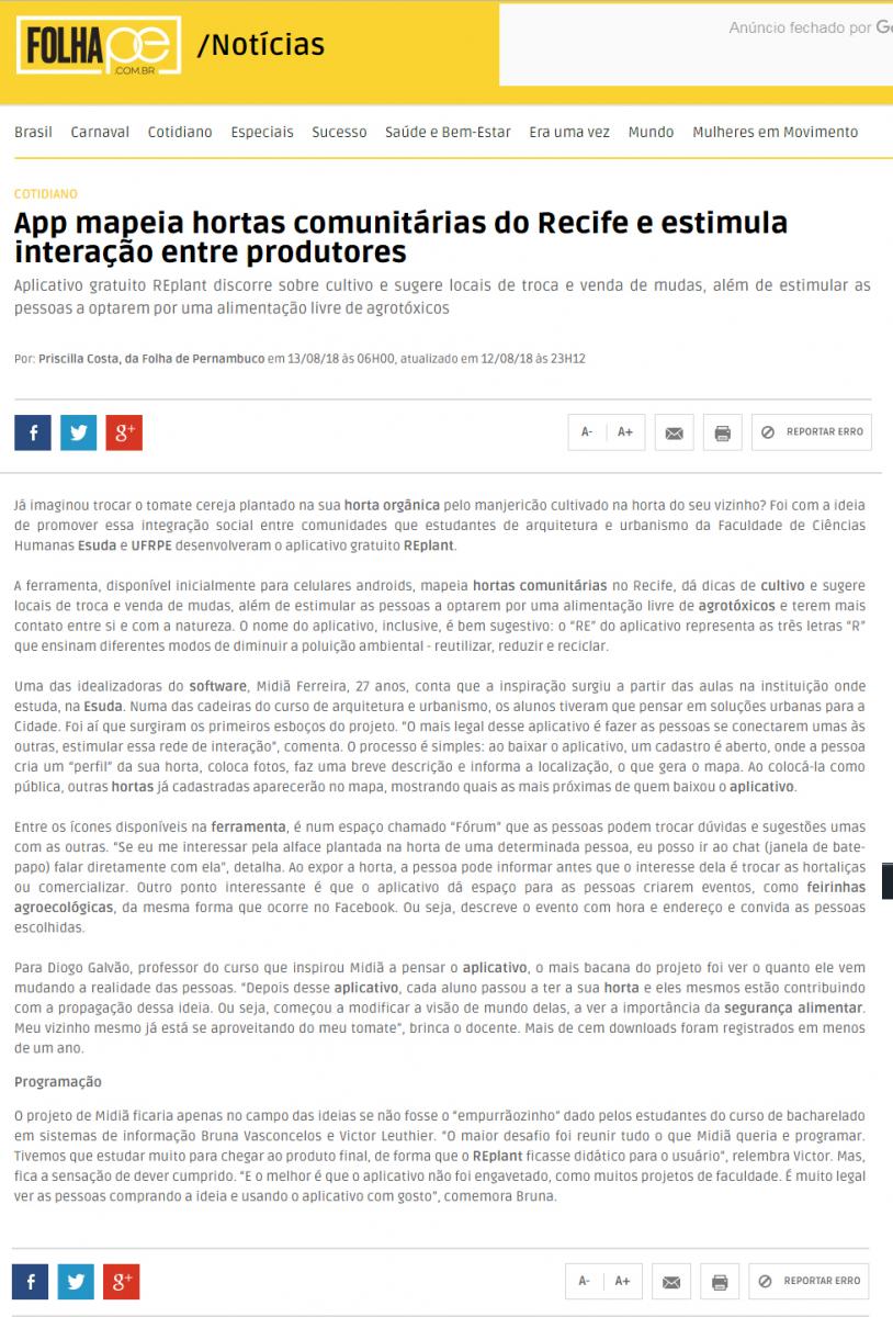 [FOLHA DE PERNAMBUCO] App mapeia hortas comunitárias do Recife e estimula interação entre produtores
