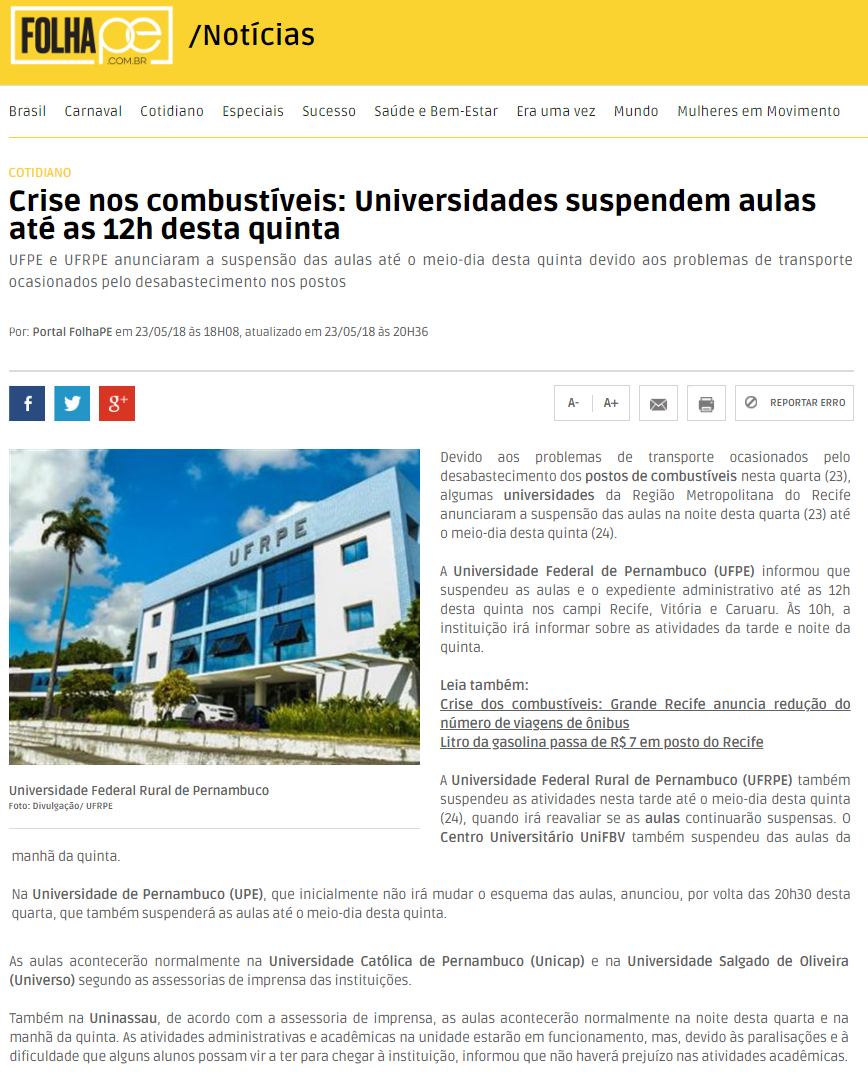 [FOLHA DE PERNAMBUCO] Crise nos combustíveis: Universidades suspendem aulas até as 12h desta quinta