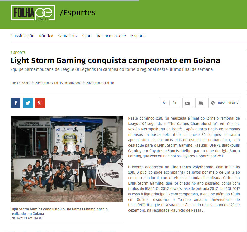 [FOLHA DE PERNAMBUCO] Light Storm Gaming conquista campeonato em Goiana
