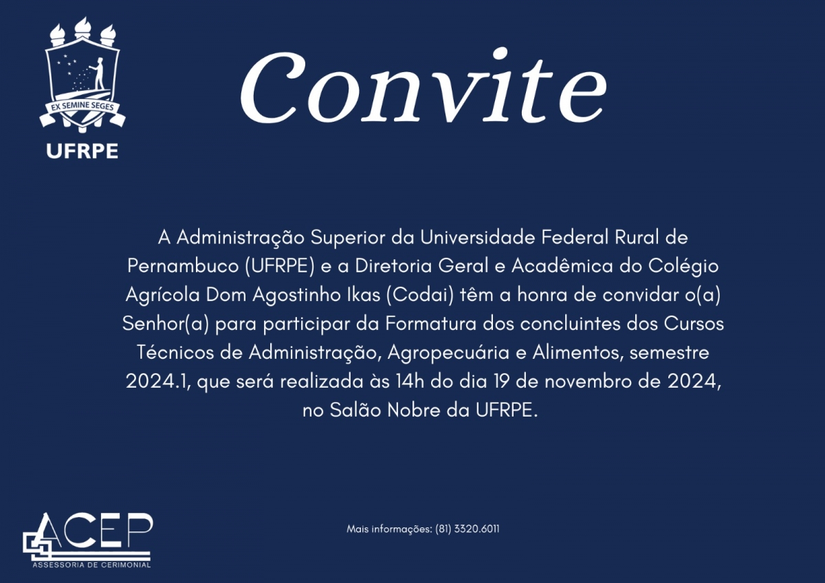 A Formatura dos concluites dos Cursos de Administração, Agropecuária e Alimentos ocorrerá às 14h do dia 19 de novembro, no Salão Nobre. Dirigentes, homenageados(as), orador, juramentistas e estudantes destques precisam se apresentar à equipe do Cerimonial 30 minutos antes do início da Solenidade.
