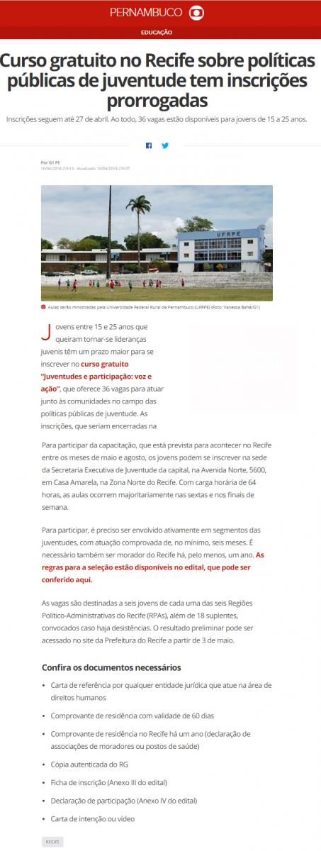 [G1] Curso gratuito no Recife sobre políticas públicas de juventude tem inscrições prorrogadas