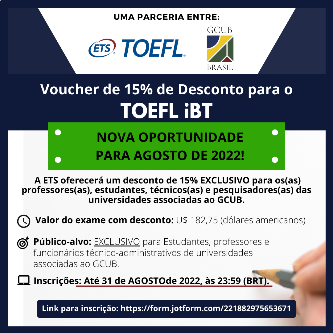 O Núcleo de Internacionalização do Instituto IPÊ informa que o GCUB, em parceria com a Educational Testing Service (ETS), concede nova oportunidade para solicitação de voucher com desconto de 15% para a realização do Exame TOEFL iBT. Esse desconto é exclusivo para professores(as), estudantes, técnicos(as) e pesquisadores(as) das universidades associadas ao GCUB.