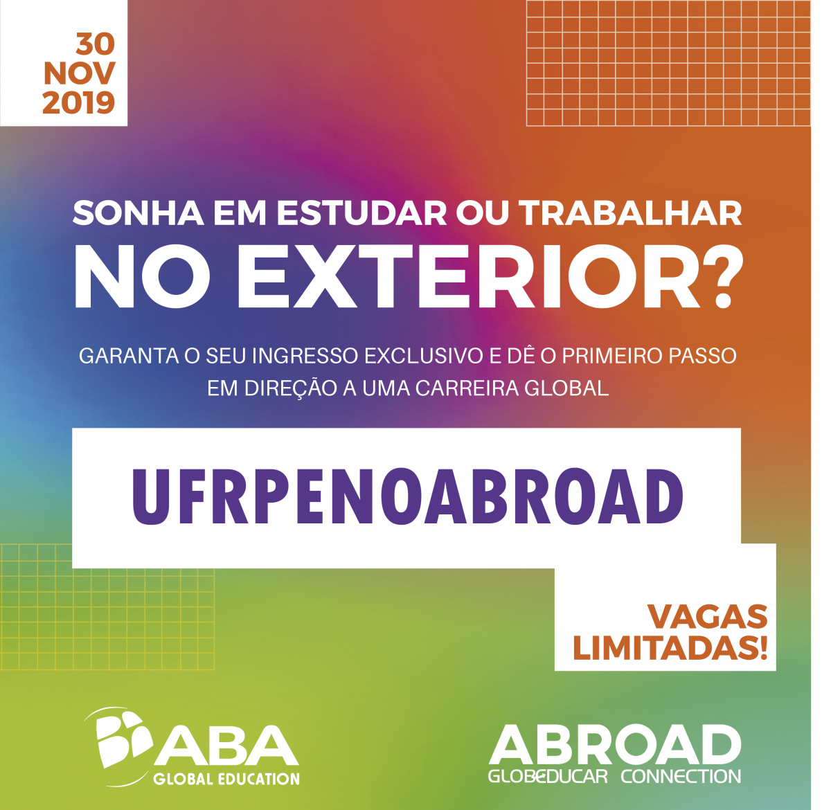 O Globeducar, centro de educação e carreira da ABA Global Education, promove o ABROAD, primeiro evento imersivo sobre estudo e carreira internacional. O evento acontece na ABA Aflitos, no dia 30 de novembro e as inscrições podem ser realizadas no Sympla: http://bit.ly/2NGlWAd