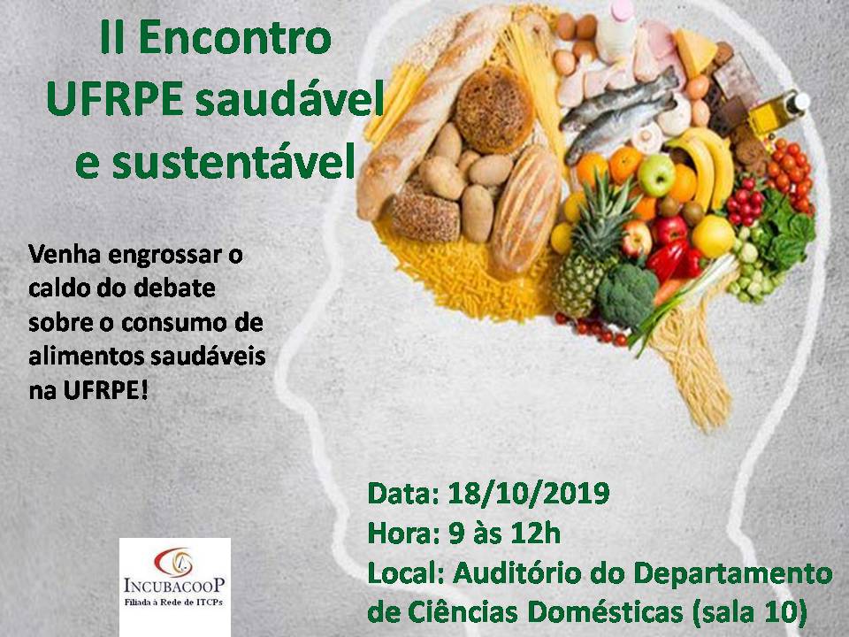 Será realizado no dia 18 de outubro, das 9h às 12h, o segundo Encontro UFRPE Saudável e  Sustentável. O evento é organizado pela Incubacoop e irá acontecer na sala 10 do Auditório do Departamento de Ciências Domésticas. O encontro tem como objetivo discutir sobre a oferta e qualidade dos alimentos na UFRPE.