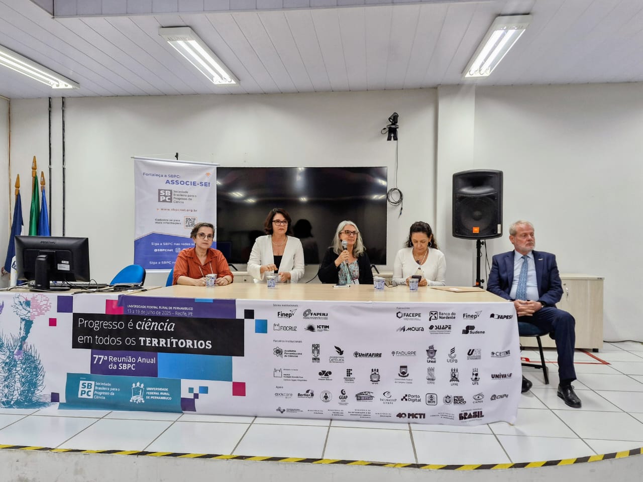No segundo dia da 77ª Reunião Anual da Sociedade Brasileira para o Progresso da Ciência (SBPC), realizada na Universidade Federal Rural de Pernambuco (UFRPE), a atenção se voltou para os desafios e as estratégias relacionadas à infraestrutura de pesquisa no país. Um dos destaques da programação foi a mesa-redonda “Infraestrutura de pesquisa no país: diagnóstico e ação das agências de fomento”, que contou com a participação de representantes de instituições importantes no apoio à ciência no Brasil.