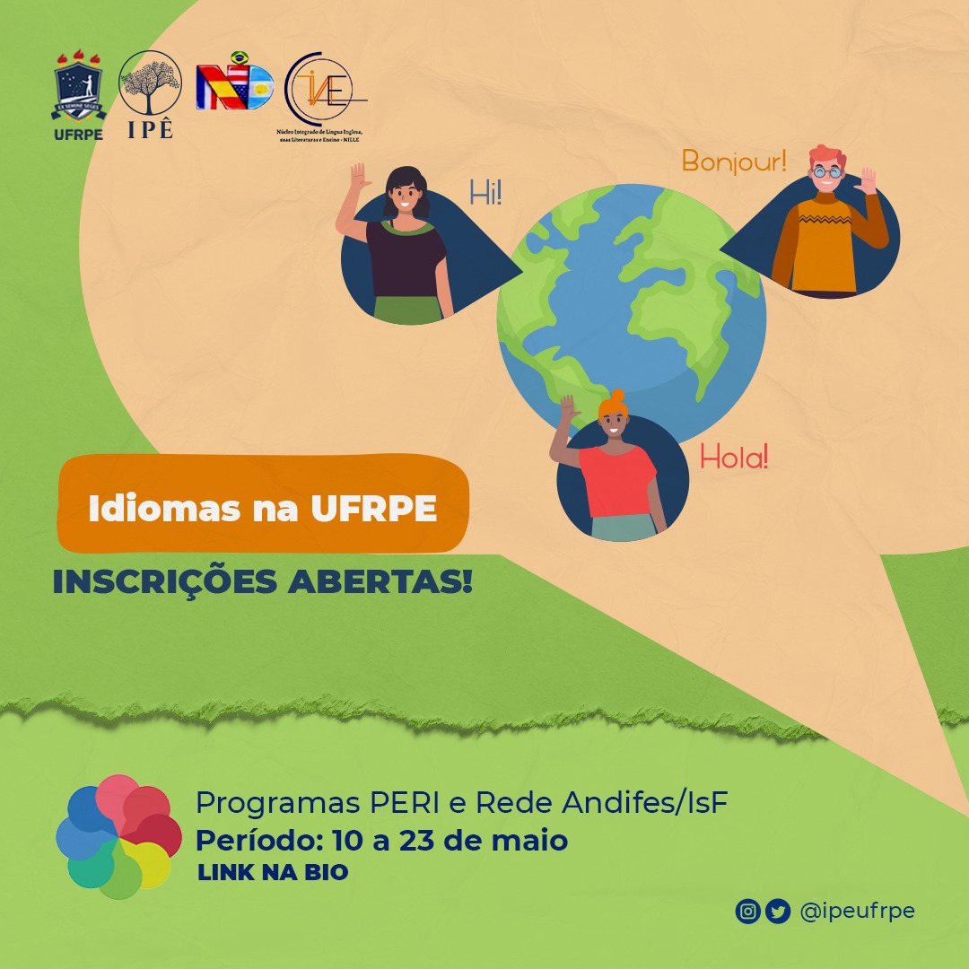 O Núcleo de Internacionalização do Instituto Ipê em parceria com o NID, NILLE e UEADTec torna público o edital para seleção de candidatos aos cursos remotos e presencial de Espanhol, Francês e Inglês, do Programa de Ensino Remoto de Idiomas (PERI); e, aos cursos remotos de Inglês, Espanhol e Português como Língua Estrangeira (PLE) da Rede ANDIFES- IsF (Idiomas sem Fronteiras).