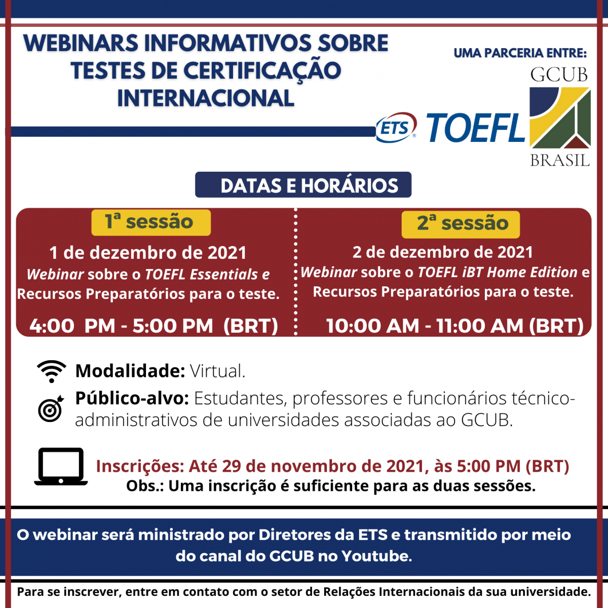GCUB divulga série de Webinars informativos sobre os exames TOEFL iBT Paper Edition e TOEFL Essentials, realizados no âmbito da parceria entre a Educational Testing Service- ETS e o GCUB. Os webinars ocorrerão nos dias 01 e 02 de dezembro e contará como  palestrantes os diretores da ETS no Brasil, Professora Adiane Blum e Professor Edson Canela.