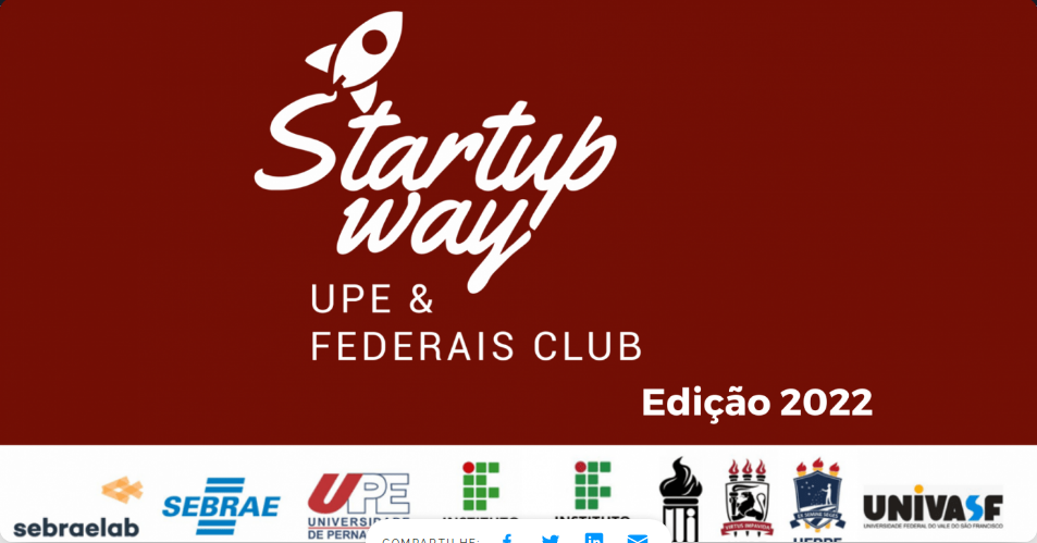 O Núcleo de Empreendedorismo e Inovação - NEI, divulga que a 4ª edição do Startup Way UPE + Federais Club vai rolar entre 25 de abril e 11 de maio de 2022. Se trata de uma experiencia imersiva para que discentes de graduação e pós-graduação desenvolvam competências e habilidades exigidas pelo mercado e fundamentais para a modelagem de novos negócios.