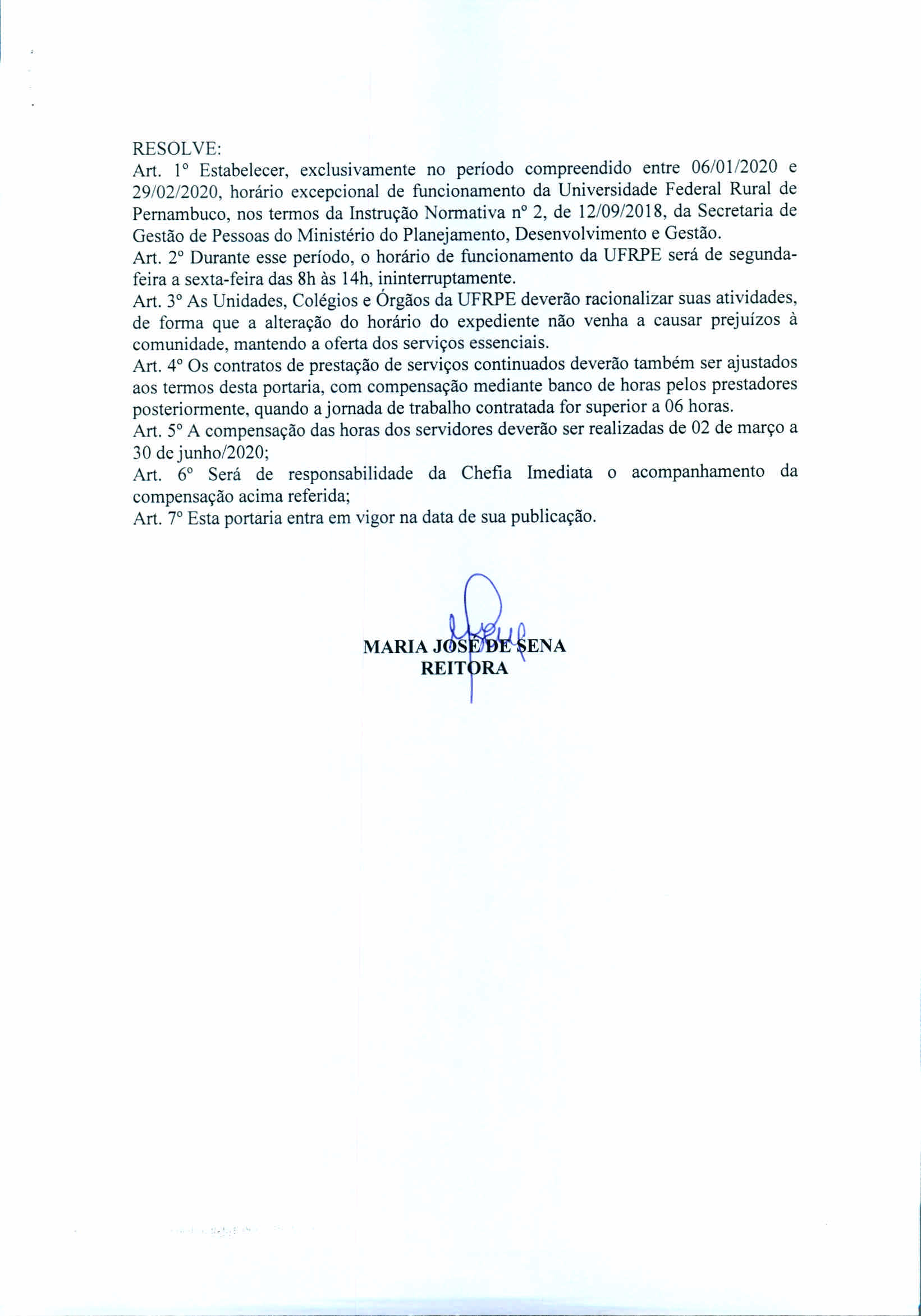 1- Em hipótese alguma deverá haver prejuízo ou descontinuidade nas atividades acadêmicas e administrativas já programadas pelos diversos Setores da UFRPE, em decorrência do horário excepcional do que trata a Portaria 01-GR de 02/01/2020;