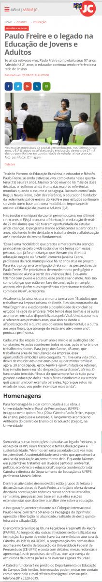 [JORNAL DO COMMERCIO] Paulo Freire e o legado na Educação de Jovens e Adultos