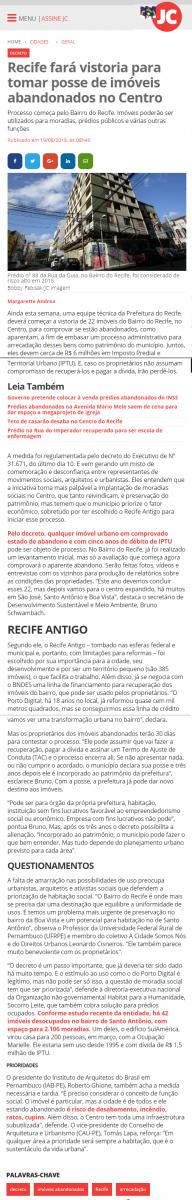 [JORNAL DO COMMERCIO] Recife fará vistoria para tomar posse de imóveis abandonados no Centro
