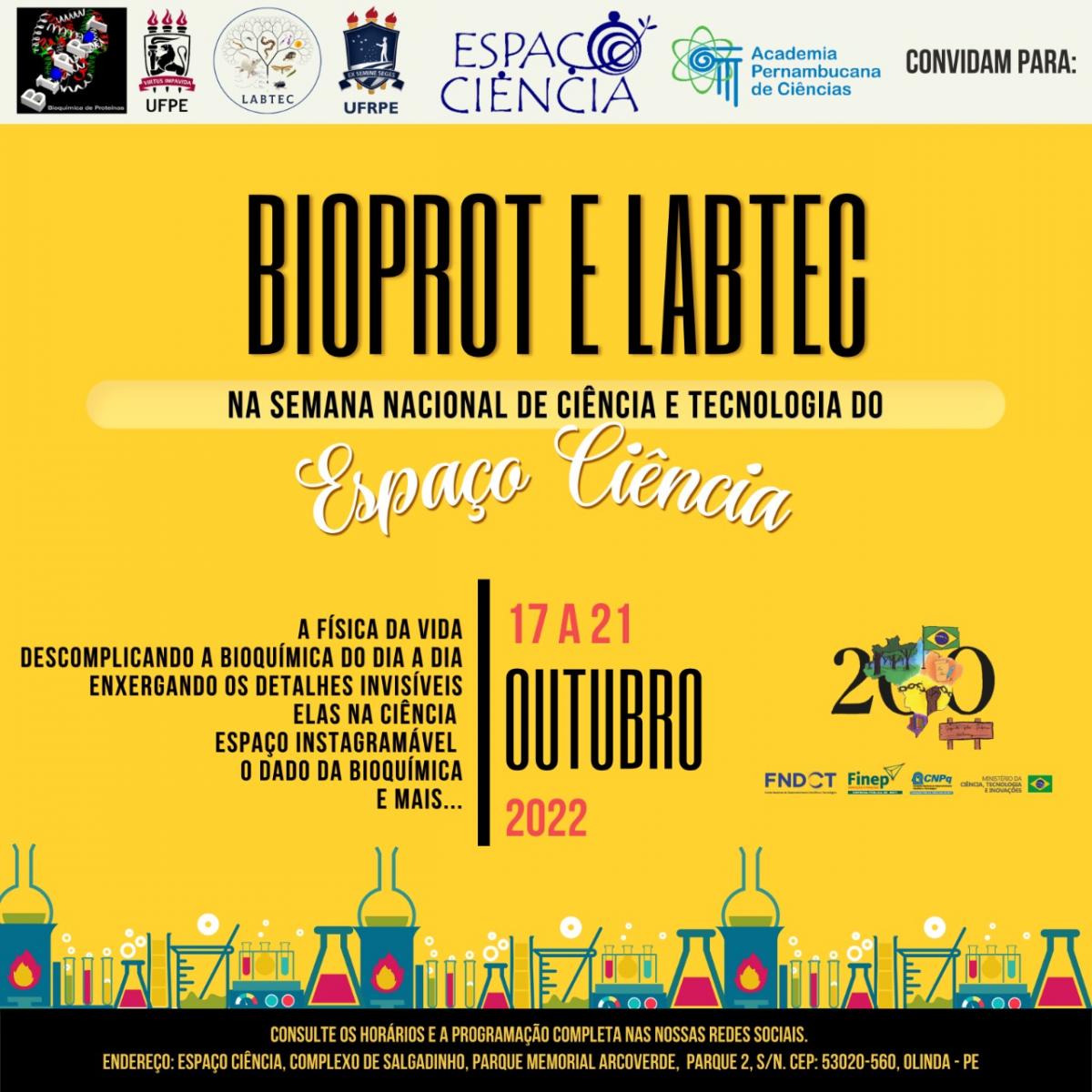 O Laboratório de Biofísica Teórico-Experimental e Computacional da UFRPE (@labtecufrpe) e o Laboratório de Bioquímica de Proteínas da UFPE (@bioprot_ufpe) estarão no Espaço Ciência, de 17 a 21 de outubro de 2022, durante a Semana Nacional de Ciência e Tecnologia 2022, para realizar diversas atividades com o público visitante desse incrível museu interativo, localizado no Complexo de Salgadinho, no limite entre os municípios de Olinda e Recife. Haverá oficinas, jogos e exposições sobre diversos temas incluindo, claro, a Bioquímica e a Biofísica. Em breve você poderá conferir a programação completa, com os horários das oficinas, nas redes sociais.