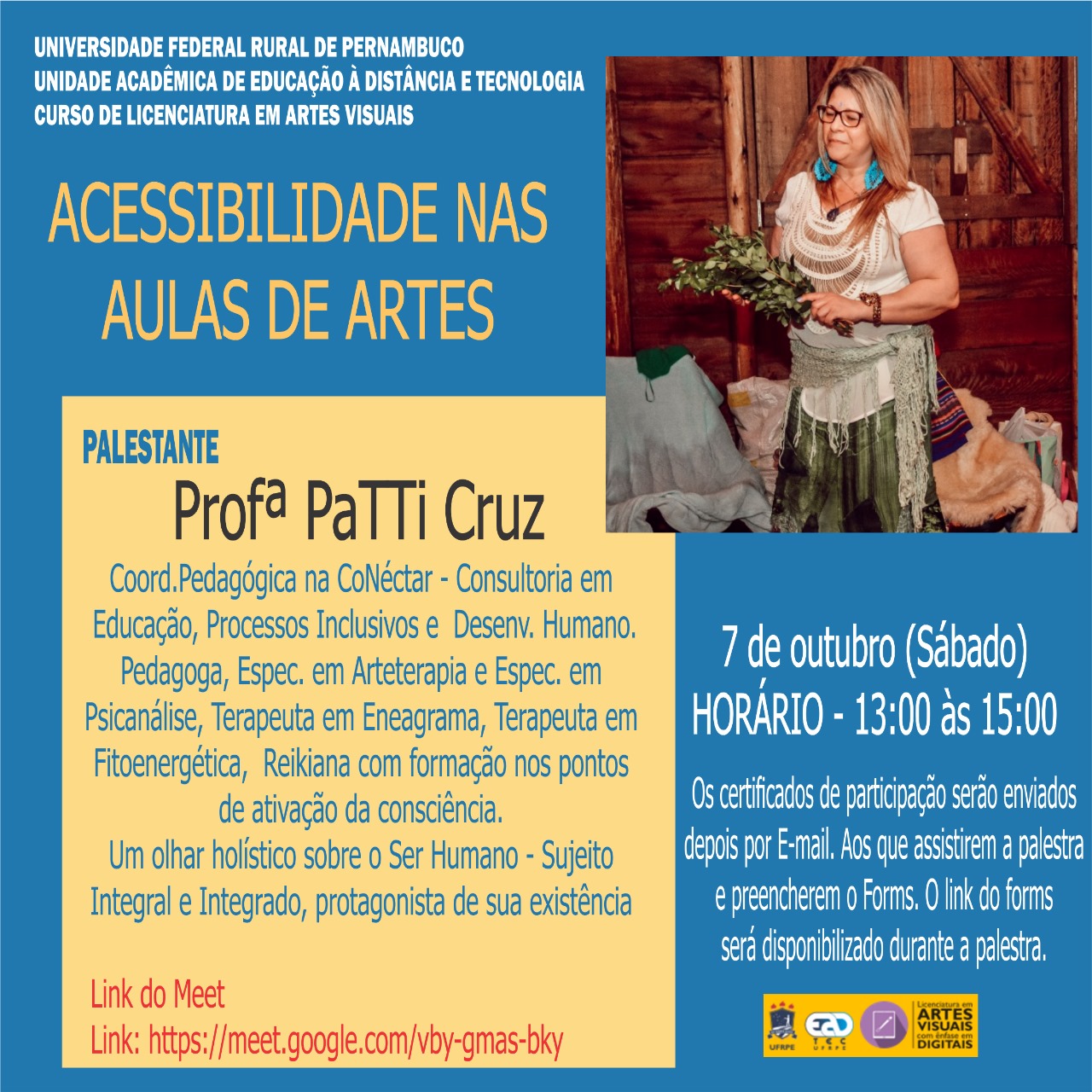 O curso de Licenciatura em Artes Visuais com Ênfase em Digitais da UAEADTec/UFRPE promoverá a palestra "Acessibilidade nas aulas de artes", ministrada pela Profa. Patti Cruz, no próximo sábado (07/10/23), das 13h às 15h.