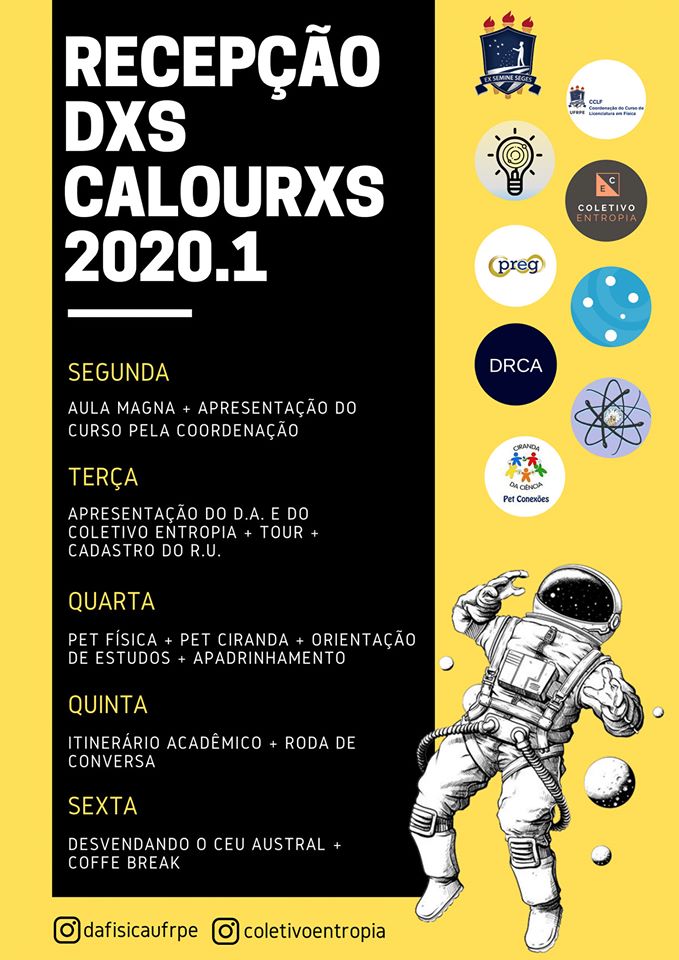 O Departamento de Física (DF) preparou uma programação especial para a recepção dos calouros do primeiro semestre, que começa em toda a UFRPE nesta terça-feira (02/03). As atividades envolvem diversos segmentos do departamento e contará com diversos parceiros. A ação foi organizada pelo Diretório Acadêmico de Física, pelo projeto de ensino Coletivo Entropia e pela coordenação do curso.