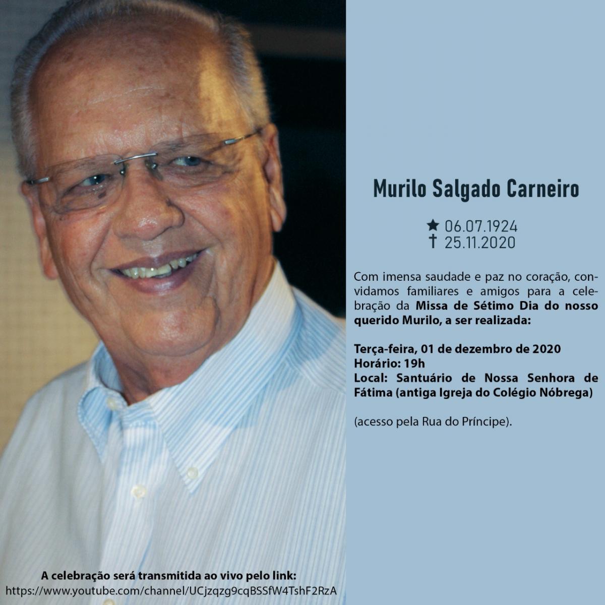 Familiares do ex-reitor da UFRPE Murilo Salgado Carneiro, falecido na última semana, convidam para a missa de sétimo dia, a se realizar às 19h desta terça-feira (1º/10) no Santuário Nossa Senhora de Fátima - antiga igreja do Colégio Nóbrega. A cerimônia será transmitia ao vivo pelo YouTube, pelo link: www.youtube.com/channel/UCjzqzg9cqBSSfW4TshF2RzA