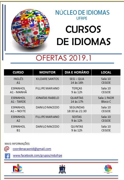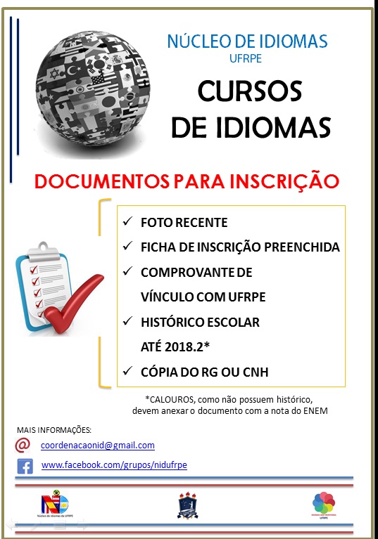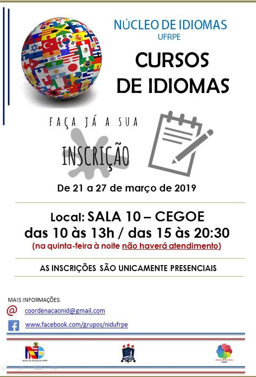 Finalizam amanhã, 27/07, as inscrições presenciais para os interessados que desejam estudar Inglês ou Espanhol pelo Núcleo de Idiomas (NID). O atendimento acontece na Sala 10 do CEGOE (Centro de Ensino de Graduação), das 15h às 20h30. Podem se matricular alunos, servidores (técnico-administrativos e docentes) e os terceirizados que prestam serviço à UFRPE. As aulas terão início dia 1º de abril, variando o início de acordo com o(s) dia(s) da semana do curso escolhido.