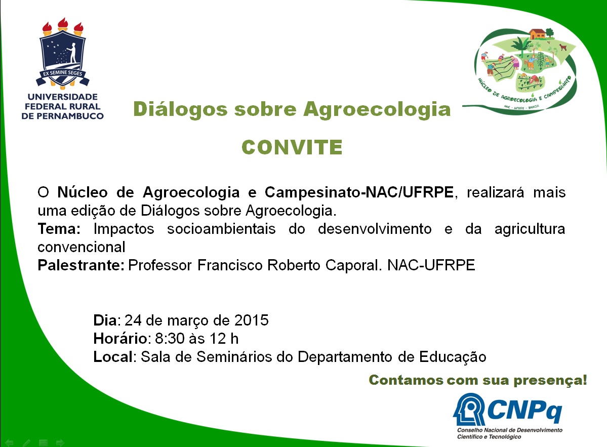O NAC - Núcleo de Agroecologia e Campesinato, da UFRPE realiza de mais uma edição dos Diálogos Sobre Agroecologia no próximo dia 24, na sala de Seminários do Departamento de Educação, das 8h30 às 12h. O encontro terá como tema os Impactos socioambientais do desenvolvimento e da agricultura convencional cuja palestra será do professor Francisco Roberto Caporal(UFRPE).