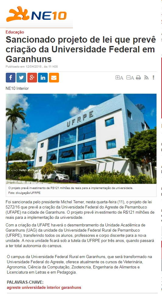 [NE10] Sancionado projeto de lei que prevê criação da Universidade Federal em Garanhuns