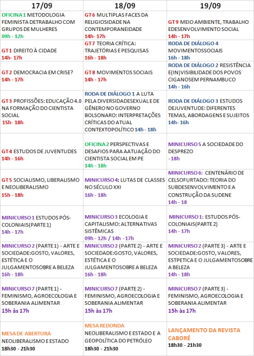 Mais informações sobre as propostas das rodas de diálogo, oficinas, minicursos e Grupos de Trabalho (GT’s) podem ser acessadas em: https://semanadesociaisufrpe.tumblr.com