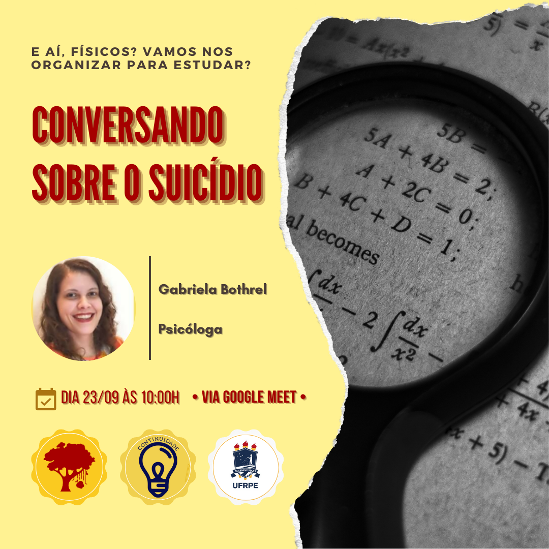 Nesta próxima quarta-feira, no dia 23/09, das 10 h às 12 h, o projeto de extensão: “E aí físicos? Vamos nos organizar para estudar?” terá uma roda de conversa sobre o suicídio: “Conversando sobre o suicídio”, com a psicóloga Gabriela Bothrel Echeverria.