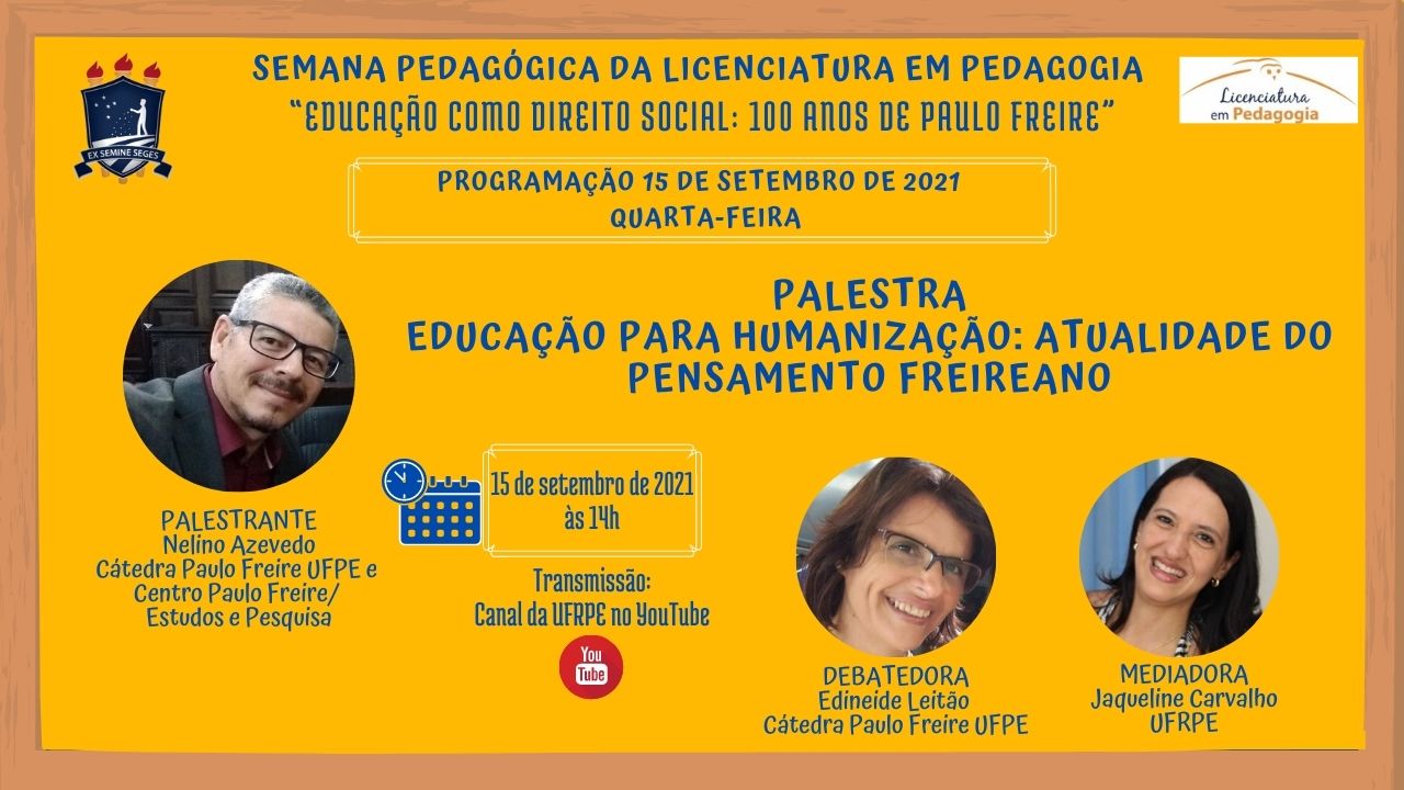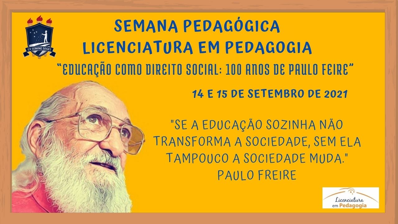 O Curso de Licenciatura em Pedagogia da UFRPE tem o prazer de apresentar a Semana Pedagógica 2021, que acontecerá nos dias 14 e 15 de setembro. Evento voltado para estudantes de graduação e docentes do nosso curso. A semana pedagógica traz uma temática sobre o EDUCAÇÃO COMO DIREITO SOCIAL: 100 ANOS DE PAULO FREIRE. A principal característica do evento é compartilhar saberes diversos à luz das ideias freireanas, bem como promover a interação entre estudantes e docentes no semestre letivo 2020.2. É totalmente online e gratuito e confere certificado. Portanto, garantam suas inscrições. A participação efetiva de todos é essencial.