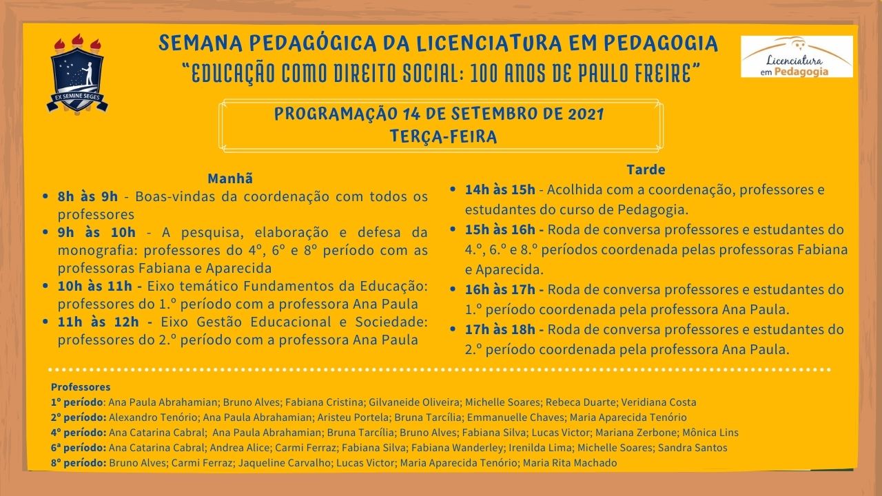 O curso de licenciatura em Pedagogia apresenta: A Semana Pedagógica nos dias 14 e 15 de setembro de 2021
