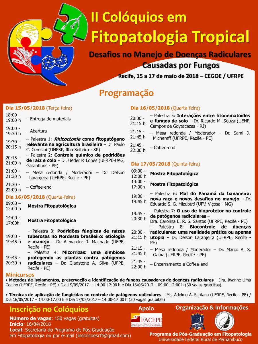 No período de 15 a 17 de maio de 2018, o Programa de Pós-Graduação em Fitopatologia (PPGF) da Universidade Federal Rural de Pernambuco (UFRPE) estará promovendo o evento denominado Colóquios em Fitopatologia Tropical 2018, em Recife. Esse evento terá como tema central “Desafios no Manejo de Doenças Radiculares Causadas por Fungos” e terá como objetivo propiciar ao público o acesso aos conhecimentos atuais e avançados sobre diferentes assuntos relacionados aos desafios do manejo das doenças radiculares, com ênfase na ecologia e epidemiologia de fungos associados à murchas vasculares, podridões e doenças de colo de plantas, além do manejo integrado dessas doenças.