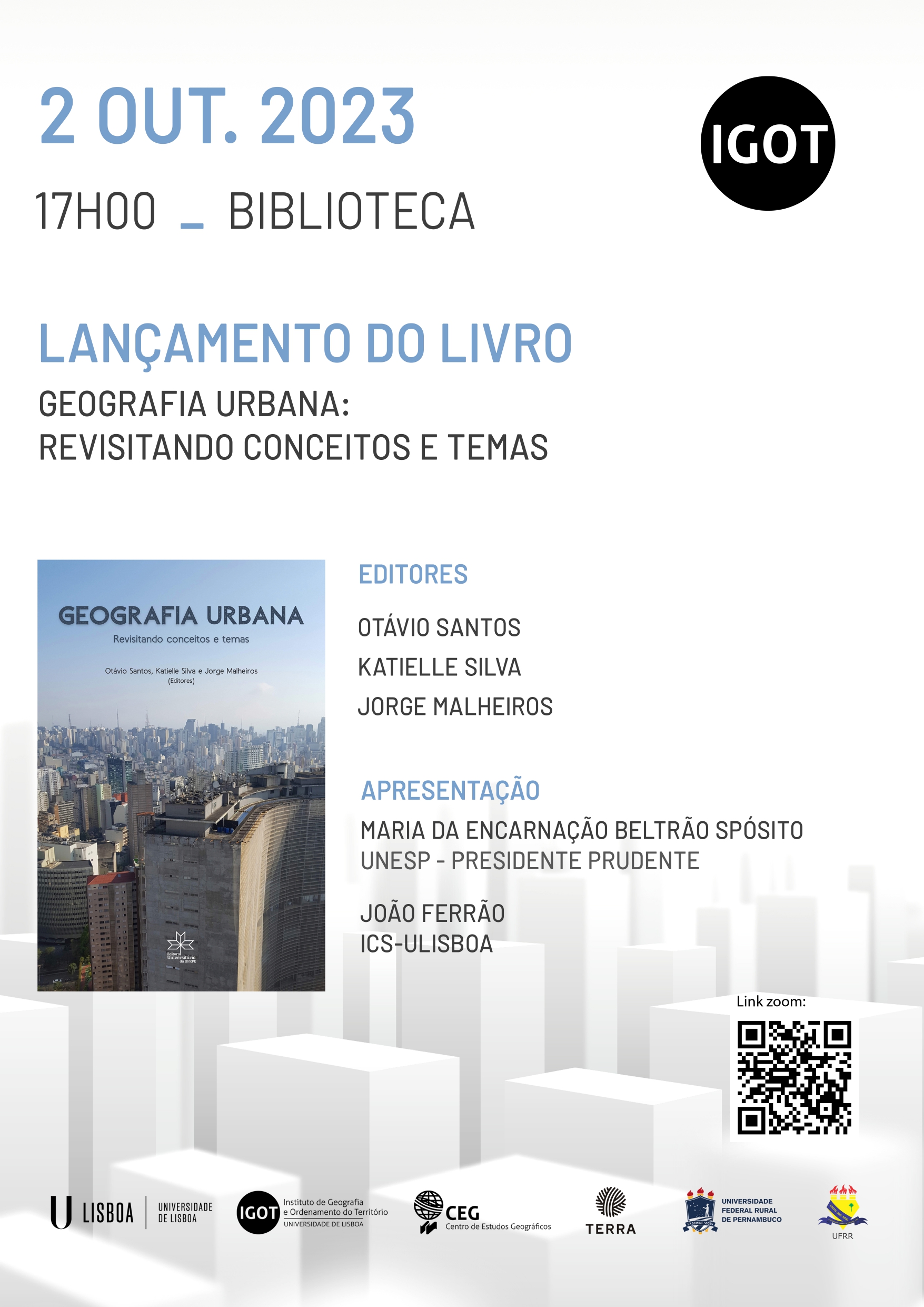 O professor Otávio Santos, do Departamento de História, lancará nessa próxima segunda-feira, 02/10, as 13h (horário de Brasília), a coletânea de textos "Geografia Urbana: revisitando conceitos e temas", em atividade remota com pesquisadores e co-autores da obra na Universidade de Lisboa.