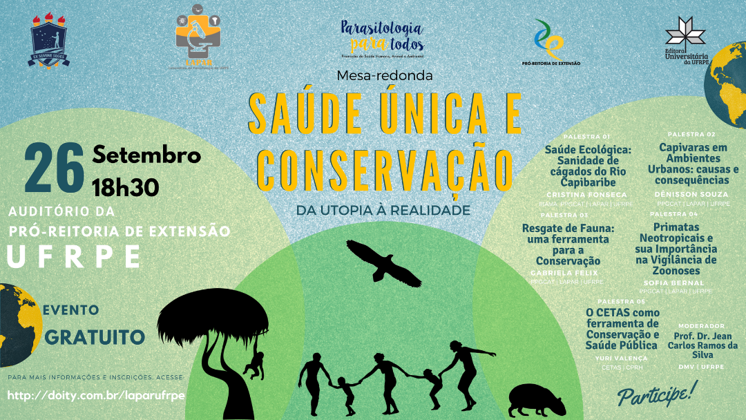 O Laboratório de Parasitologia (LAPAR) e o Programa de Pós-Graduação em Ciência Animal Tropical convidam a todos para participar da mesa redonda "Saúde Única e conservação: da utopia à realidade" que ocorrerá no dia 26/09/2018 às 18h30, no auditório da Pró-Reitoria de Extensão (PRAE). O evento faz parte das atividades do projeto de extensão "Parasitologia para Todos: promoção da saúde humana, saúde animal e saúde ambiental".