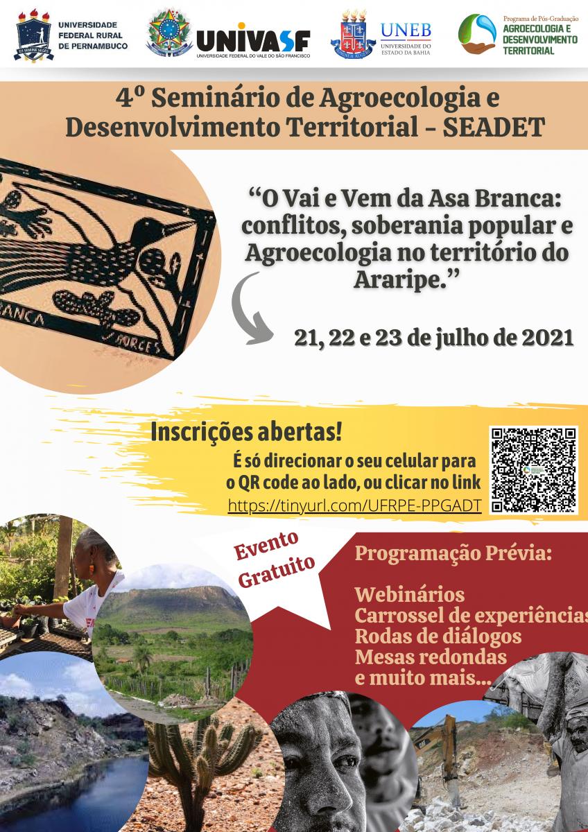 O Programa de Pós-Graduação em Agroecologia e Desenvolvimento Territorial - PPGADT (UNIVASF/UNEB/UFRPE) irá realizar o 4º Seminário de Agroecologia e Desenvolvimento Territorial, nos dias 21, 22 e 23 de julho de 2021, em formato remoto com o lema: _O vai e vem da asa branca: Conflitos, soberania popular e agroecologia no Sertão do Araripe._