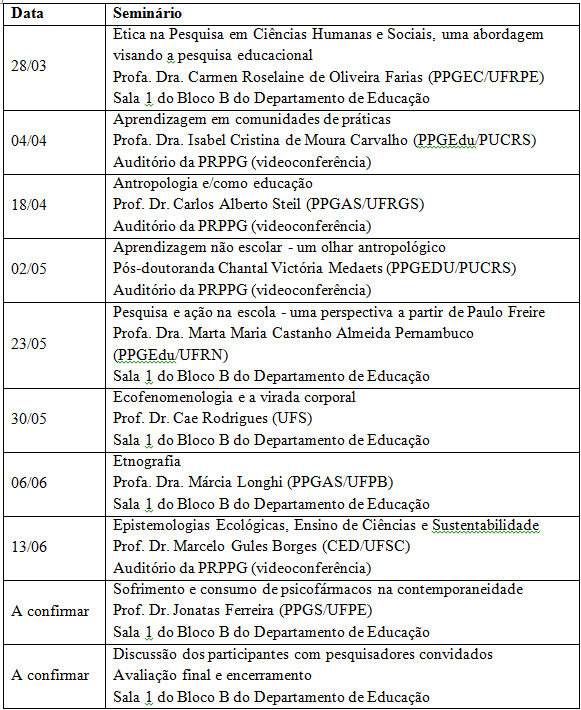 Os Seminários neste semestre são promovidos em parceria com o Grupo de Pesquisa SobreNaturezas: Epistemologias Ecológicas e visam proporcionar o intercâmbio e o diálogo entre pesquisadores e pós-graduandos do Programa de Pós-Graduação em Ensino das Ciências da Universidade Federal Rural de Pernambuco (PPGEC/UFRPE) com convidados de diferentes instituições: PUCRS, UFRGS, UFSC, UFS, UFRN, UFPB e UFPE. O evento permite, assim, a integração de pesquisadores das Regiões Sul e Nordeste do País e a divulgação científica, fortalecendo e ampliando as redes de comunicação e o intercâmbio neste campo.
