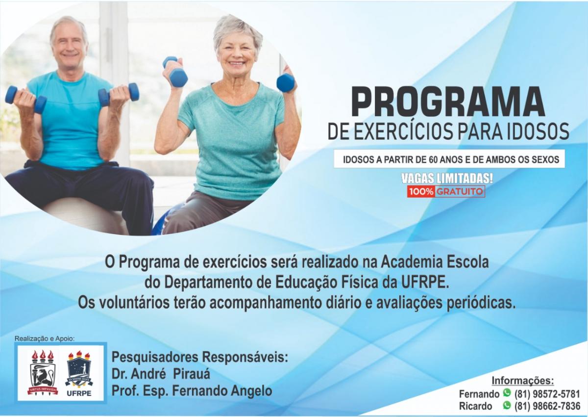 Será realizado no Departamento de Educação Física da UFRPE o Programa de Exercício para Idosos. A pesquisa será destinada aos idosos com mais de 60 anos de ambos os sexos, tendo como um dos principais benefícios a melhoria da capacidade e autonomia funcioal.