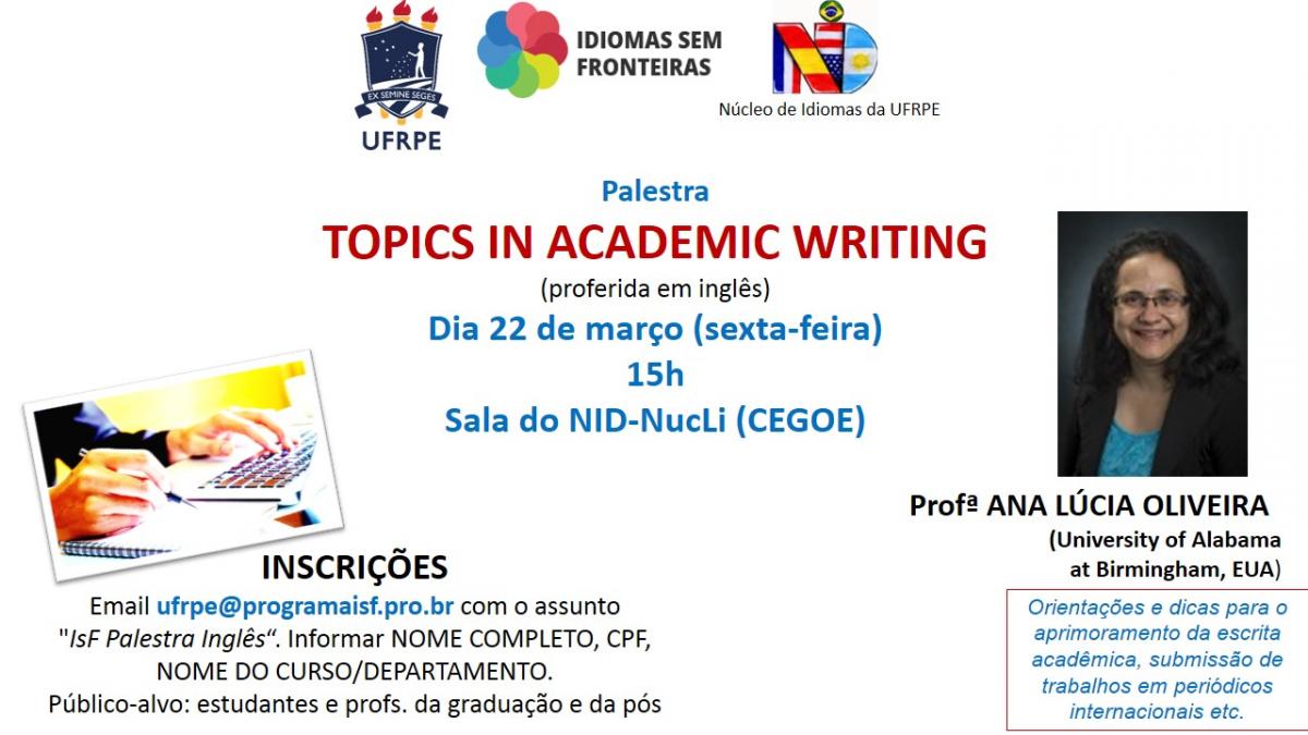 O Programa Idiomas sem Fronteira da UFRPE realiza, na próxima sexta-feira (22/03), às 15h, a palestra TOPICS IN ACADEMIC WRITING, a ser proferida em inglês pela professora Ana Lúcia Oliveira da University of Alabama at Birmingham, EUA.