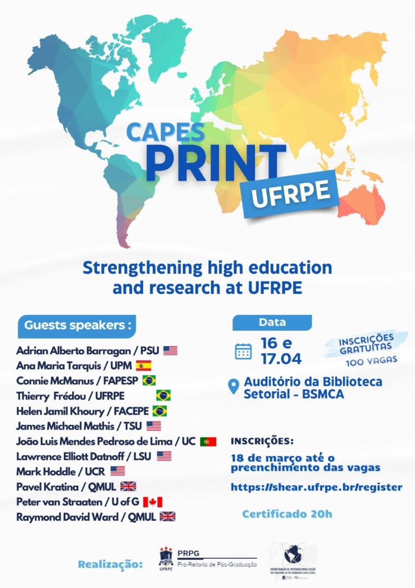 O projeto CAPES PrInt-UFRPE estará concluindo suas atividades em outubro de 2024. O próximo evento a ser realizado será "Strengthening high education and research at UFRPE" e visa reunir a Pós-Graduação da UFRPE e demais interessados no tema. O comitê CAPES PrInt-UFRPE, em colaboração com os programas de Pós-Graduação, convidou professores/pesquisadores internacionais e da UFRPE com elevado conhecimento em suas respectivas áreas de atuação, bem como experiência em internacionalização do ensino e pesquisa em suas instituições. Esses pesquisadores, também, estarão com uma estadia prolongada na UFRPE, permitindo mais discussões com a comunidade após o evento. Os interessados em dialogar com algum dos pesquisadores poderão entrar em contato com a coordenação de internacionalização da UFRPE através do e-mail <cippg.prpg@ufrpe.br>