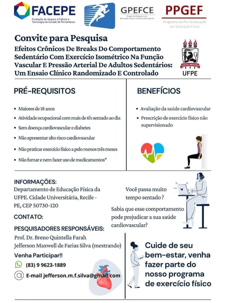 O Grupo de Pesquisa Educação Física e Ciências do esporte da UFRPE está trabalhando em um projeto intitulado "Efeitos Crônicos de Breaks do Comportamento sedentário com Exercício Isométrico na Função Vascular e Pressão arterial de Adultos Sedentários: Um Ensaio Clinico Controlado e Randomizado".