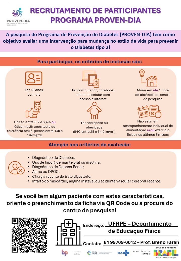 Já pensou poder detectar e cuidar de sua saúde antes de desenvolver diabetes? Docentes do curso de Educação Física da UFRPE estão trabalhando em um projeto de pesquisa que visa a prevenção da pré-diabetes. A iniciativa se chama Multicêntrico e envolve a UFRPE e outros 29 centros de pesquisa e com base em mudanças no estilo de vida, como melhoria da alimentação, prática de atividade física, controle do estresse e do tabagismo, melhoria do sono, dentre outros parâmetros pretende-se prevenir a diabetes.