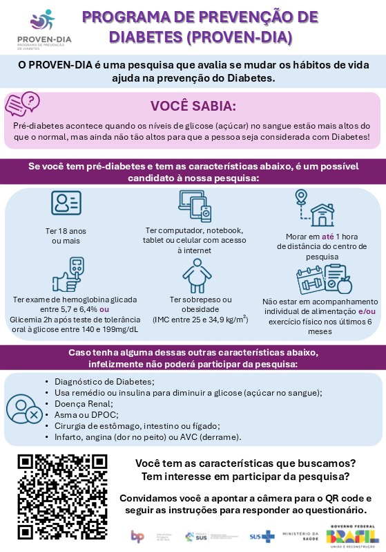 Se você tem pré-diabetes, essa é a sua chance de mudar de vida! O PROVEN é uma intervenção completa para te ajudar a reduzir a glicemia e evitar o diabetes, por meio de: